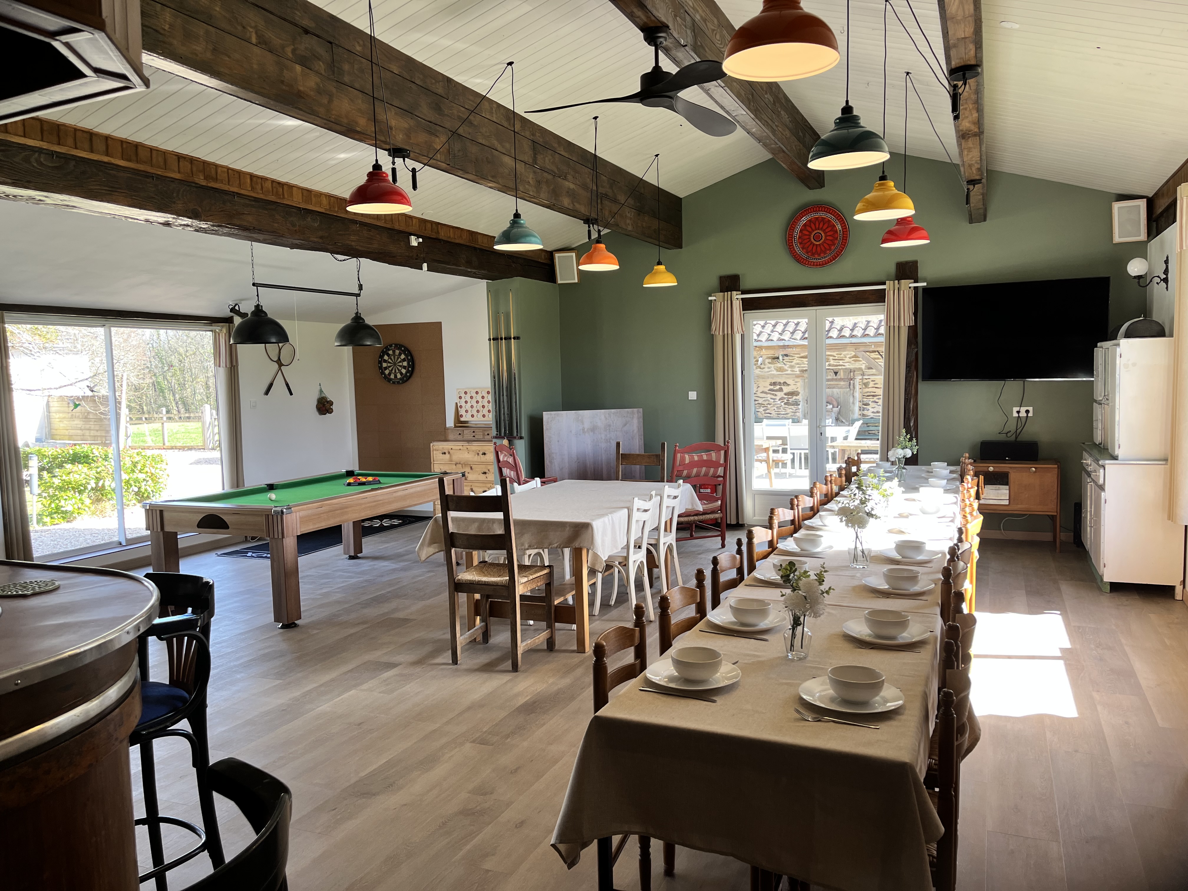 Votre groupe bénéficiera de la privatisation complète du domaine, comprenant une grande salle à manger et de jeux avec bar, une cuisine semi-professionnelle ainsi qu’une terrasse avec barbecue — idéale pour partager des repas conviviaux et des moments de détente.